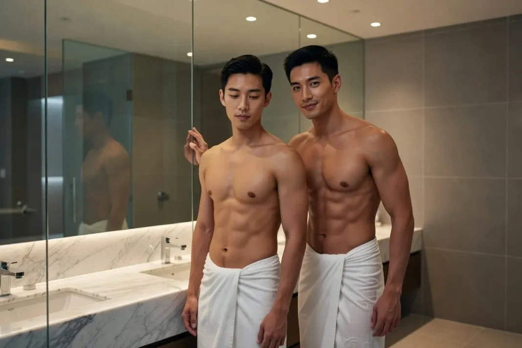 “God, I’m sweaty from all that nervous energy,” Jayden said, running a hand through his hair. He looked at the glass bathroom, then at Evan, who was unbuttoning his shirt. An idea, reckless and fueled by the evening’s triumph and the vodka tonic, formed. “Look, this is ridiculous. The bathroom’s huge. Why don’t we just… shower at the same time? Get it over with faster. We’re both guys.”
